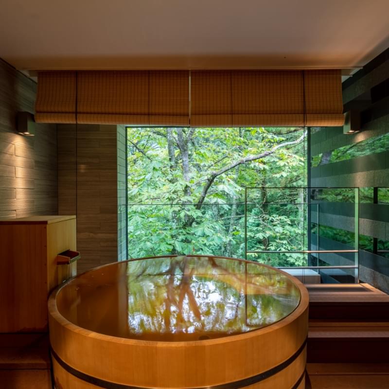坐落於箱根連山環抱中的山岳度假地, 堅實的岩肌與日本樹木交織出柔和且舒適的空間。 您可享受兩種溫泉泉質:擁有絕景的大浴場,以及被樹木包圍的客房浴池。 餐飲包含可自行選擇菜式的日本料理與充滿現場氣氛的鐵板燒, 料理人將依您的喜好獻上貼心款待。